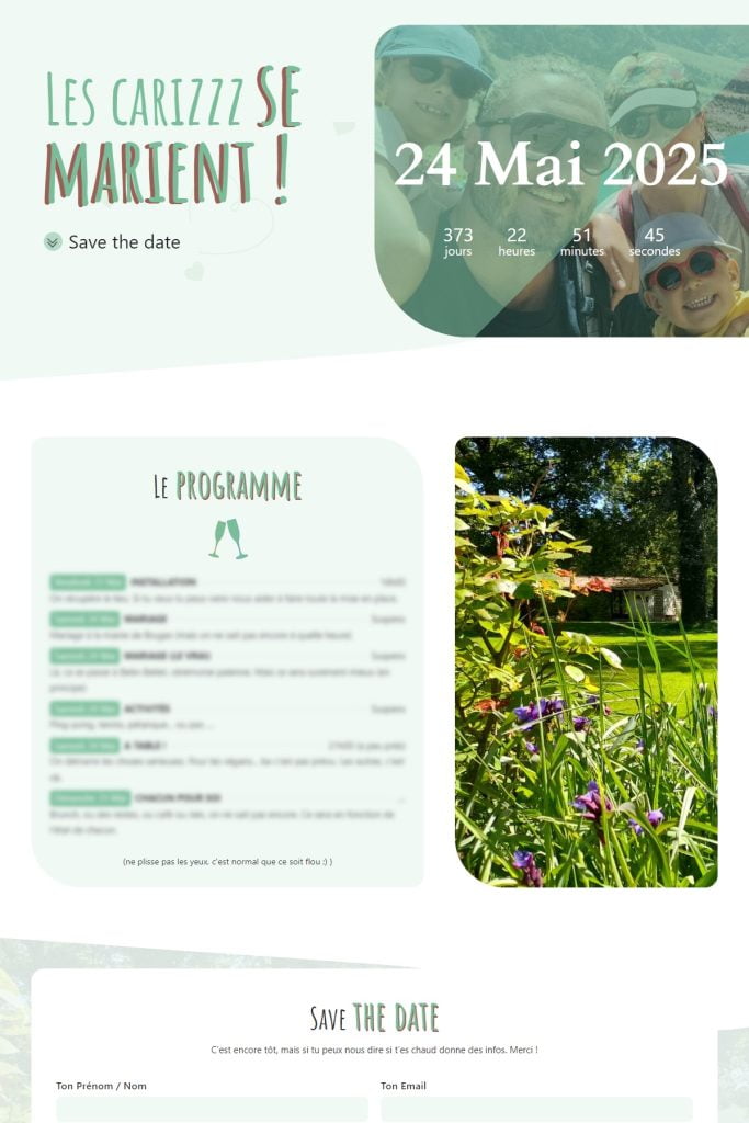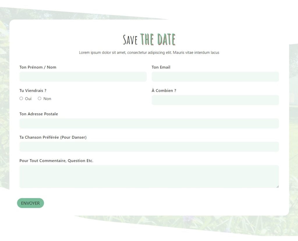 Formulaire de type « Save the date » avec demande de confirmation. Nous pourrons ajouter n’importe quelle question (quelle musique, options d’hébergement, type de repas etc)